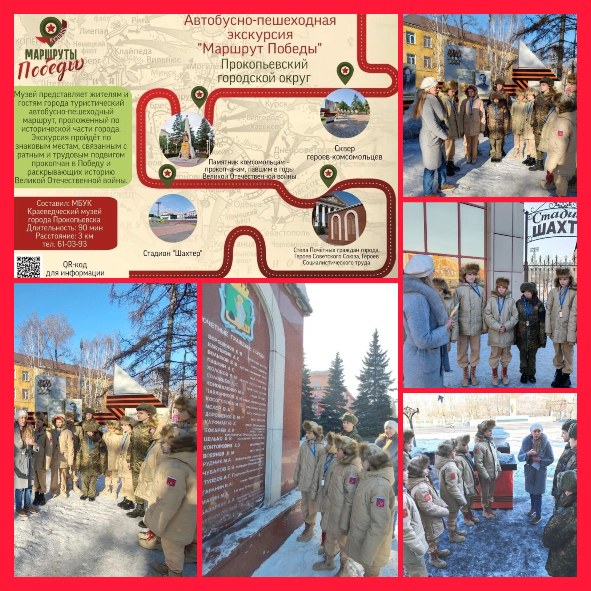 Первая точка маршрута — сквер героев-комсомольцев, где располагаются важные мемориальные объекты: памятник комсомольцам — прокопчанам, павшим в годы Великой Отечественной войны, памятные комплексы «Прокопчане — Герои Советского Союза», «Прокопчане — кавалеры ордена Славы» и другие.